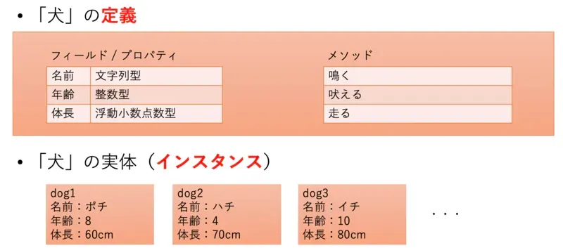 「犬」という現実世界の物体を考えてみましょう。犬を特徴できる要素として、「名前」「年齢」「体調」といった値があるのに対し、「鳴く」「吠える」「走る」といった動作も存在しています。これらをまとめて「犬」を抽象化した「定義」を作成します。